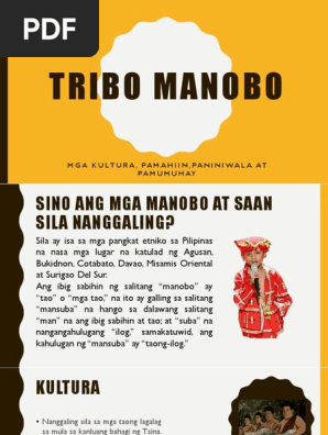 Mga Manobo Sila ay isa sa mga pangkat etniko ng Pilipinas na nasa mga lugar na katulad ng Agusan Bukidnon Cotabato Davao Misamis Oriental at Surigao Del Sur. Ang ilan sa mga ito ay ang mga Badjao Maranao Tausug Tboli at Manobo. Sisimulan natin sa kung ano ba ang ibig sabihin ng salitang ManoboMaraming mga sagot patungkol sa kung ano nga ba talaga ang ibig sabihin ng salitang Manobo.